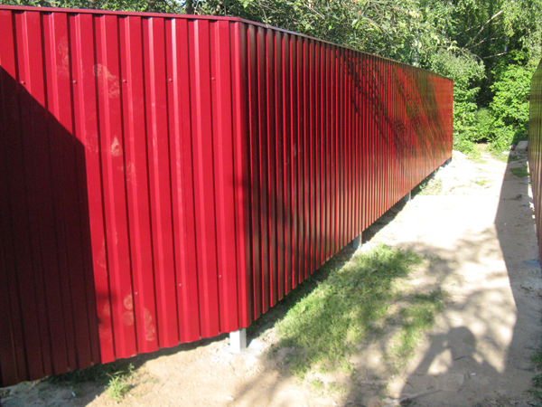4. Профнастил. Монтаж забора из профнастила обходится недорого и требует немного времени для монтажа. Такое ограждение имеет строгий внешний вид, не привлекает излишнего внимания и обладает характеристиками, сравнимыми по прочности с металлическими заборами. При необходимости его можно поднять в высоту на три-четыре метра, при этом его себестоимость не сильно увеличится. Этот вариант, возможно, самый оптимальный по соотношению цены и качества.